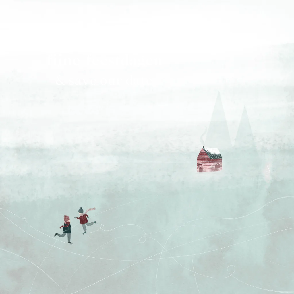Een dromerige save the date kerstkaart met een winterillustratie van schaatsende figuren en een gezellig Zweeds rood huisje in de verte. De rustige kleuren en subtiele details geven de kaart een romantische, winterse sfeer, perfect om jullie trouwdatum op een sfeervolle manier aan te kondigen tijdens de feestdagen.
