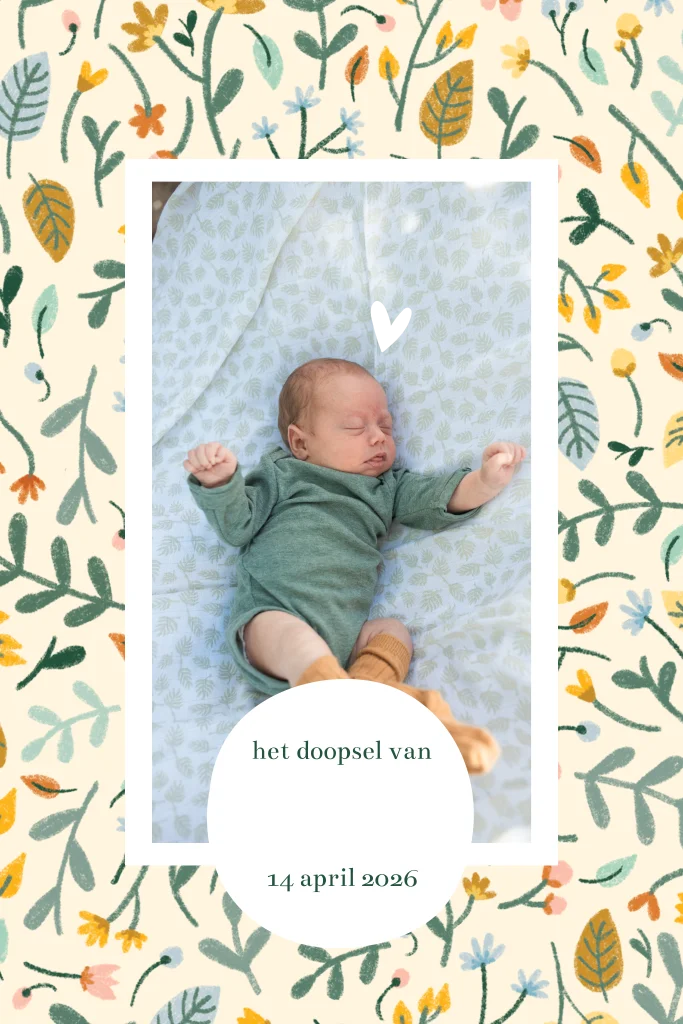 Deze lieve doopkaart heeft een illustratie van plantjes en bloemen en een foto op de voorkant. Perfect voor dit bijzondere moment voor jullie kindje. Pas het kaartje helemaal naar wens aan!