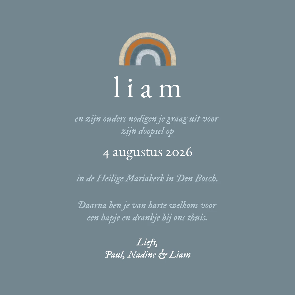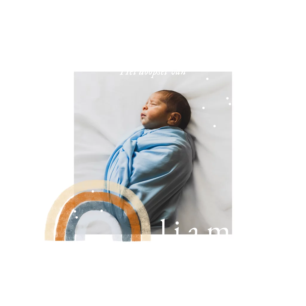 Dit kaartje is een prachtige minimalistische uitnodiging voor een doop of communie, met een lieve illustratie van een regenboog met een foto erbij. De goudfolie details maken het af. Aan de binnenzijde is ruimte voor een mooi gedicht of versje.