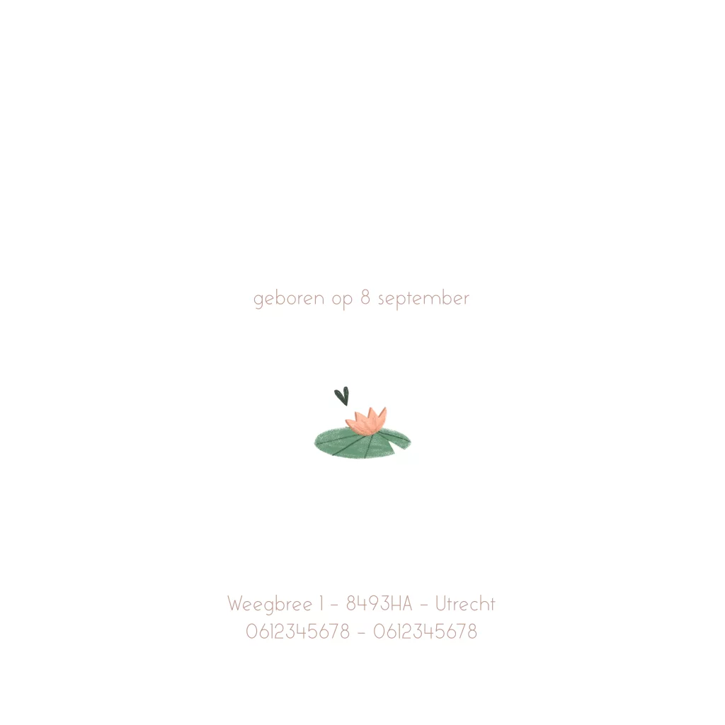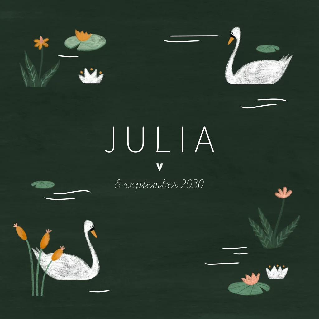 Een mooie geïllustreerde unieke geboortekaart met zwanen, en allerlei mooie bloemen en plantjes in een vijver. Het kaartje wordt extra chique met goudfolie!