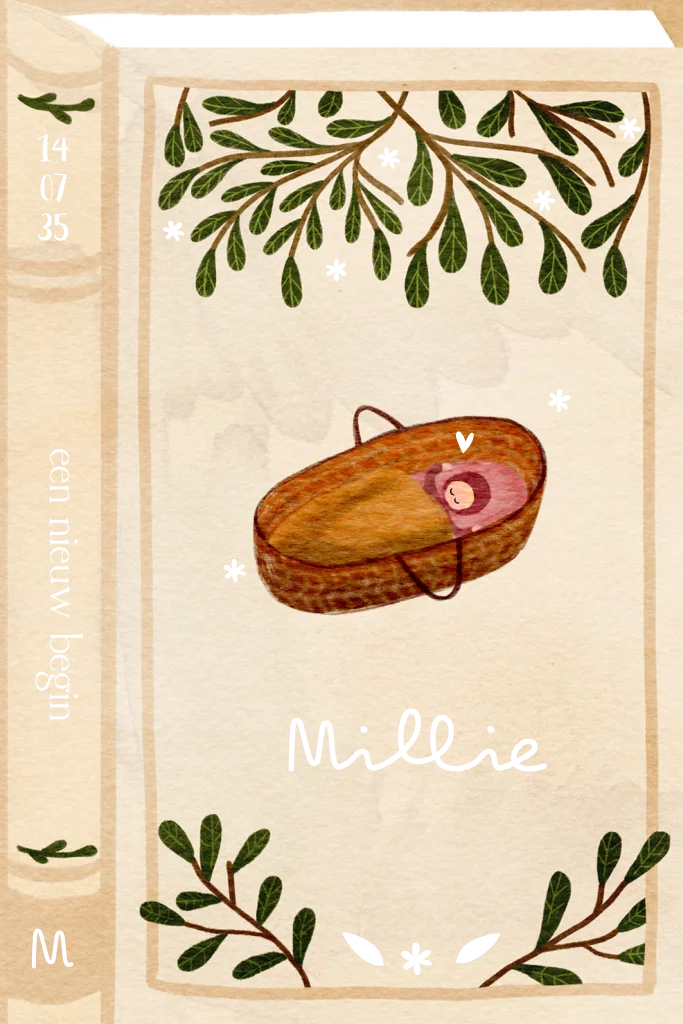 Een sprookjesachtige geboortekaart, met een unieke illustratie van de voorkant van een boek, over het nieuwe begin van dit lieve kindje. Op de voorkant staat daarnaast ook een illustratie van een wiegje en mooie blaadjes. Wil je iets aangepast zien, zoals een andere kleurstelling? Mail gerust en we passen het voor je aan. Pas de geboortekaart verder nog naar wens aan in de editor.