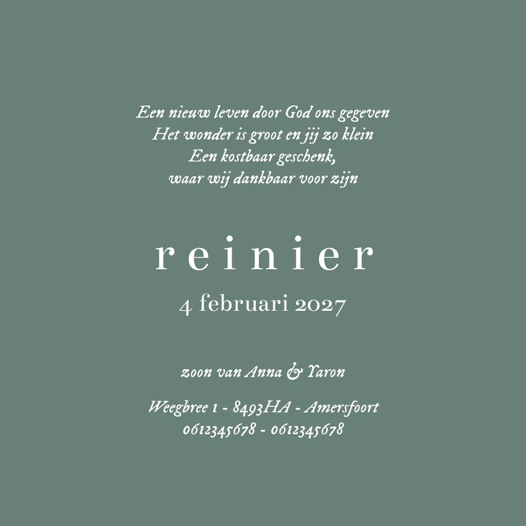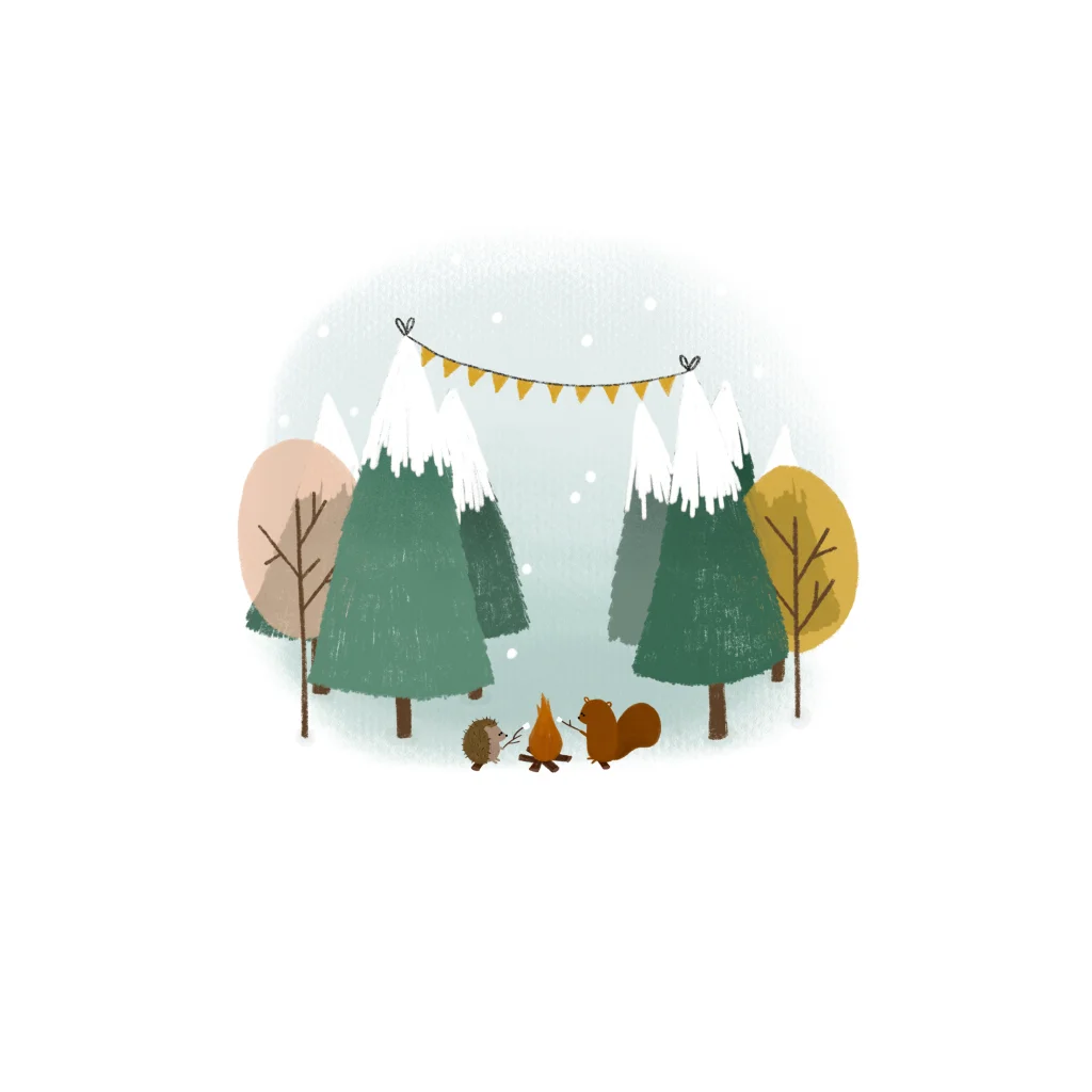 Dit kaartje is lief en minimalistisch. Een schattige illustratie van een winterbos met besneeuwde bomen en twee bosdiertjes die een marshmallow roosteren boven een kampvuurtje. Je kunt hier ook een wiegje plaatsen of andere diertjes. Aan de binnenzijde is ruimte voor een foto en een mooie tekst.