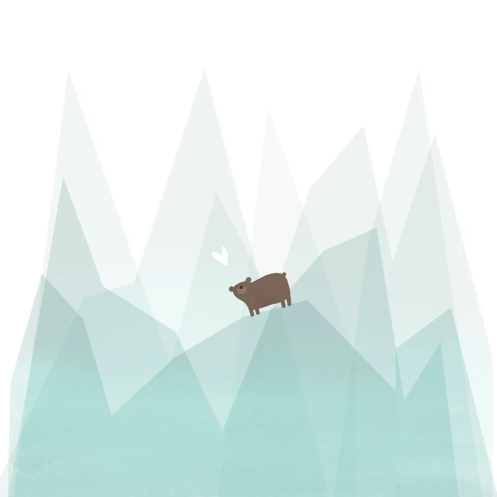Een geboortekaartje met bergen, een lief beertje en stoere zilverfolie. Liever een andere kleur folie? Pas het zelf aan in de editor.