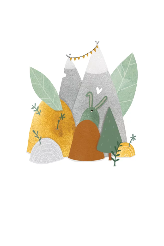 Een geboortekaartje met bergjes, plantjes en een konijntje, in waterverf look. Het kaartje heeft goudfolie.
