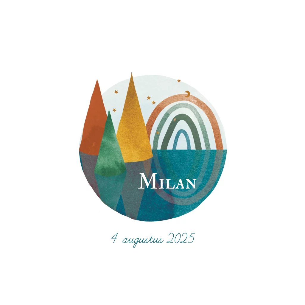 Geboortekaartje bergen regenboog sterren maan waterverf jongen