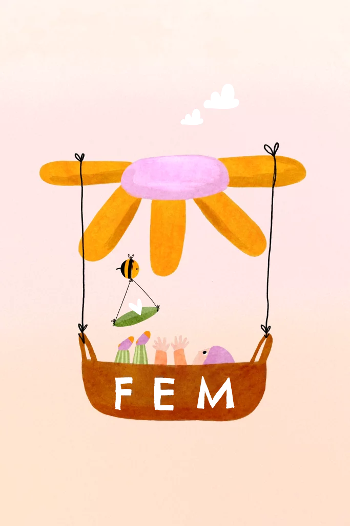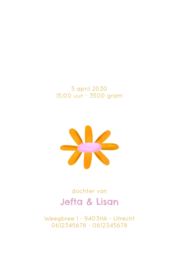 Een origineel geboortekaartje met een illustratie van een baby in een mandje, hangend aan een vrolijke bloem. In warme vrolijke kleuren, perfect voor een lente of zomer kindje.