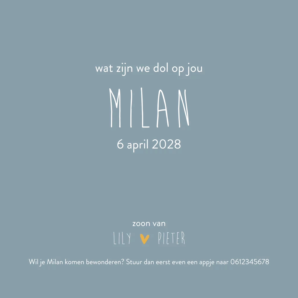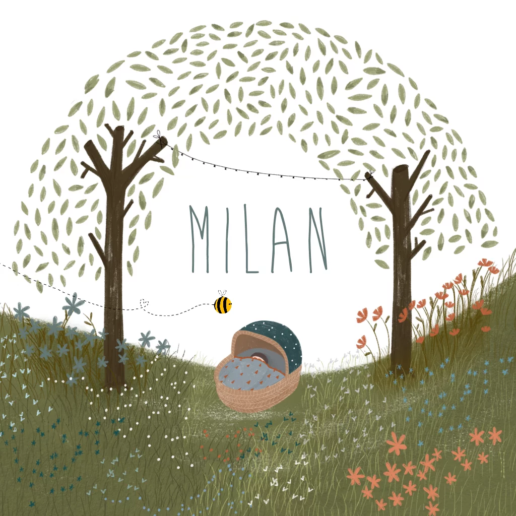 Een geïllustreerd lief geboortekaartje met een illustratie van bomen met een licht slinger ertussen in een bloemenweide. Je kunt zelf kiezen of je een wiegje of wandelwagen of iets anders tussen de bomen zet. De goudfolie op de kaart maakt het extra bijzonder! Pas de kleur aan van alle bloemetjes naar wens door op het elementje te klikken en daarna naar het kleurenpalletje te gaan.