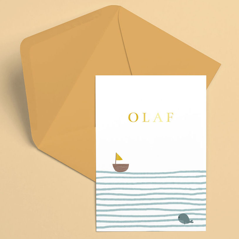 Een geboortekaartje met een minimalistische illustratie van de zee met een bootje met goudfolie zeiltje en walvis.