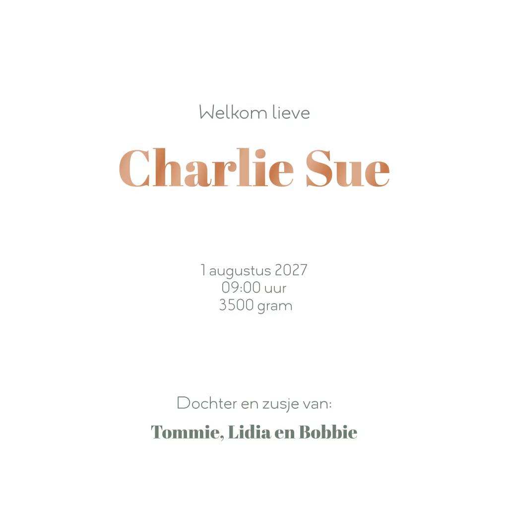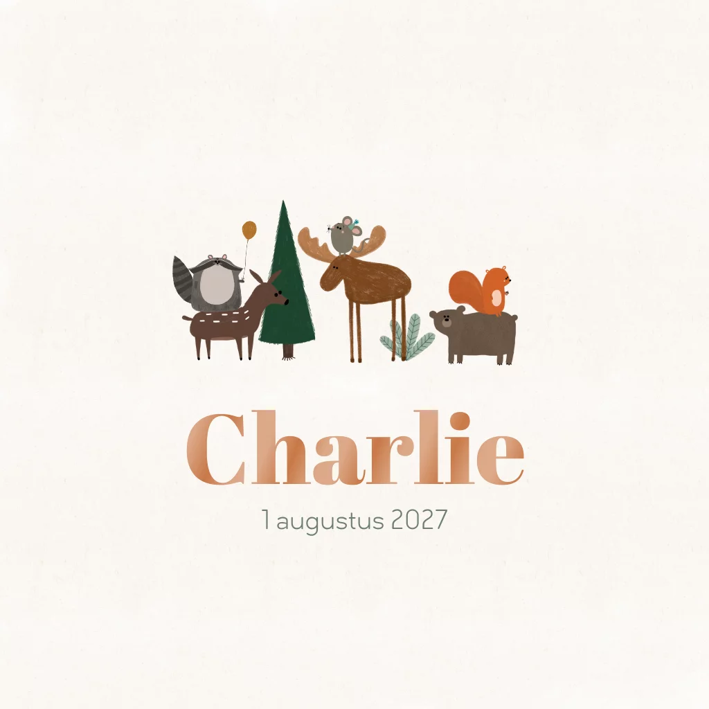 Een vrolijk, lief en rustig geboortekaartje met bosdieren rondom de naam van je kindje die in hoogglans staat. Kies zelf de kleur van de folie, of voeg diertjes toe! Op de achtergrond zit een afbeelding van papier, waardoor het lijkt alsof er vezeltjes in het kaartje zitten. Dit geeft een mooi effect!