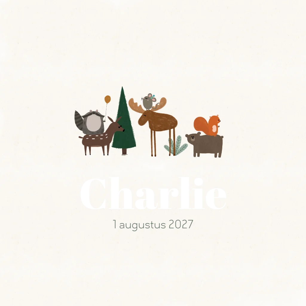 Een vrolijk, lief en rustig geboortekaartje met bosdieren rondom de naam van je kindje die in koperfolie staat. Kies zelf de kleur van de folie, of voeg diertjes toe! Op de achtergrond zit een afbeelding van papier, waardoor het lijkt alsof er vezeltjes in het kaartje zitten. Dit geeft een mooi effect!