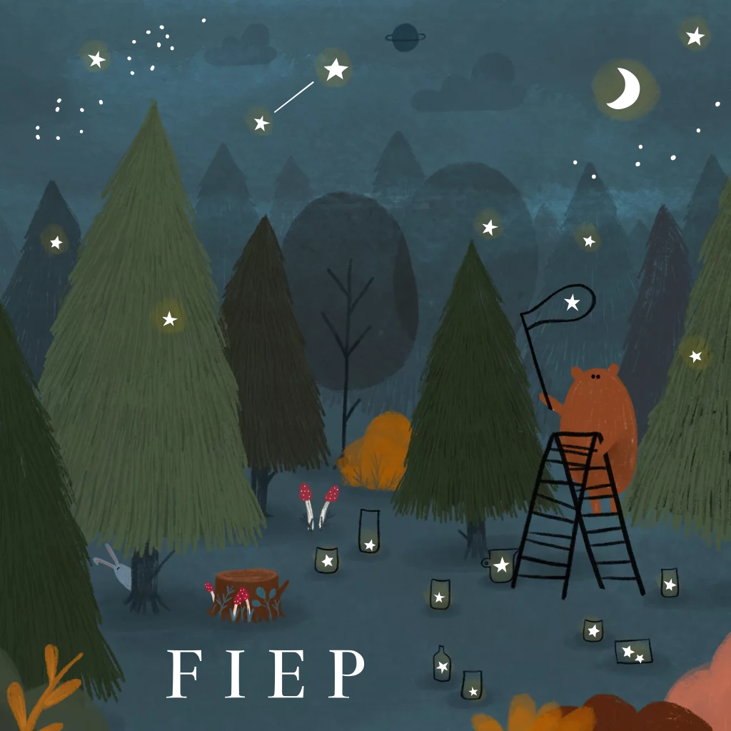 Een dromerig geboortekaartje met een knus bos vol met bosdiertjes en een lieve beer die sterren vangt en in potjes bewaard. Een gezellige dromerige sfeer die helemaal afgemaakt wordt door de goudfolie!