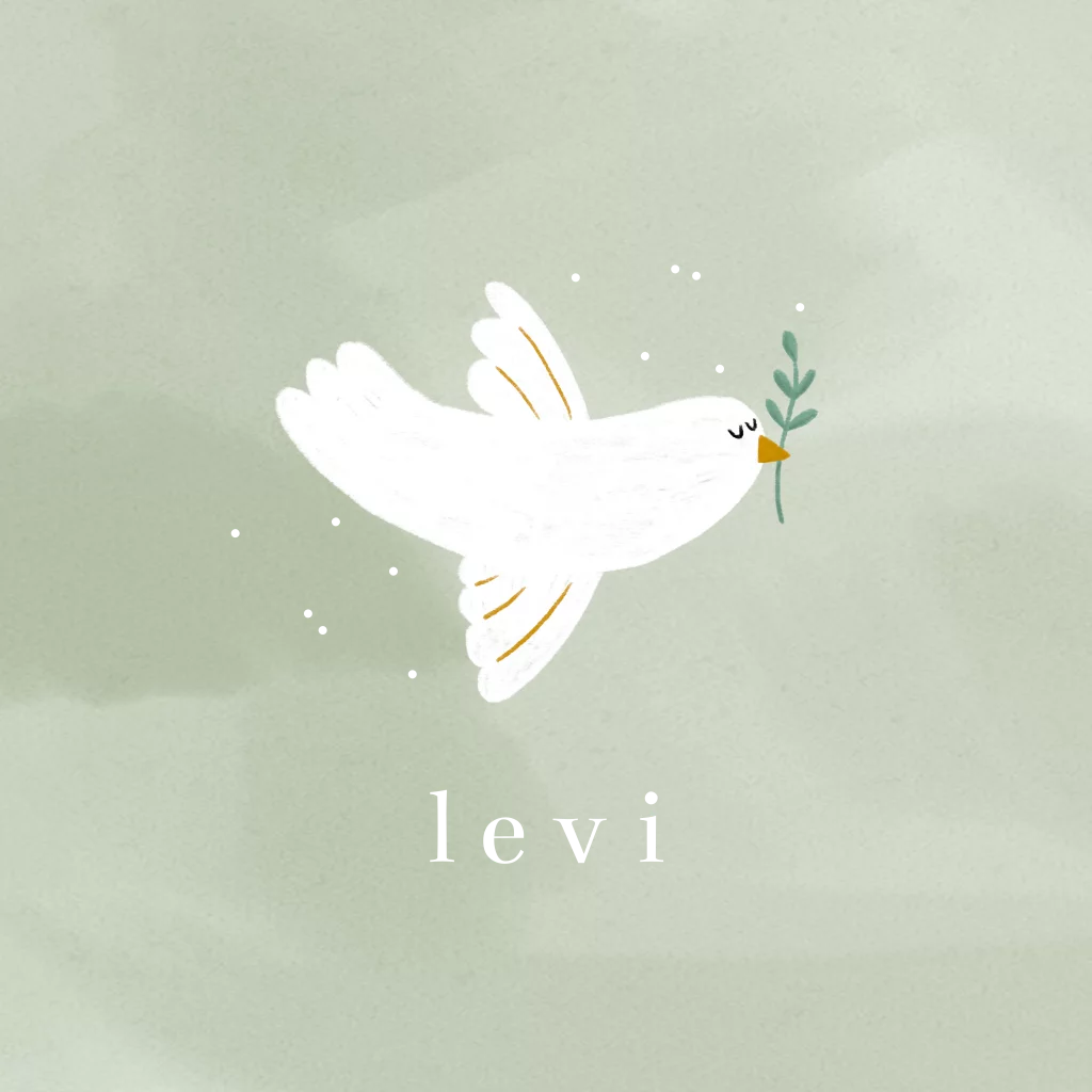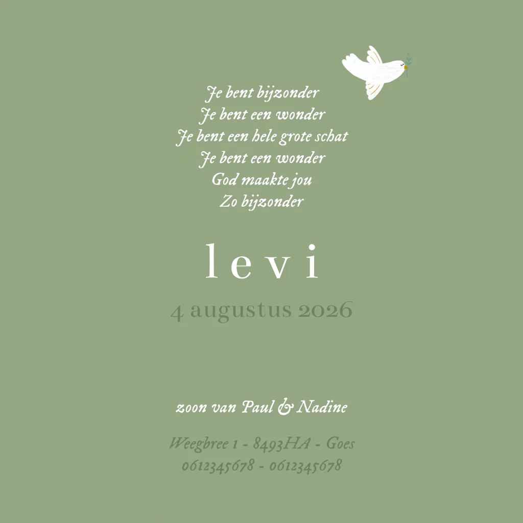 Een lief christelijk geboortekaartje met een illustratie van een duif met een olijftakje. Perfect om de komst van jullie wonder aan te kondigen! Aan de binnenkant is ruimte voor een foto en een mooie bijbel(tekst).