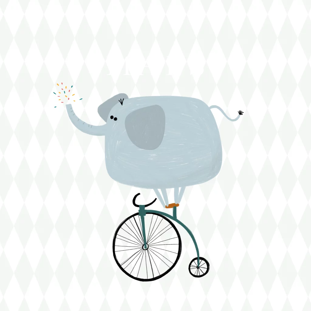 Een vrolijk en stoer geboortekaartje met een illustratie van een circus olifant op een fietsje met confetti. Het kaartje heeft zwartfolie, je kunt de kleur hiervan zelf aanpassen! De achtergrond en het fietsje kunnen ook aangepast worden.