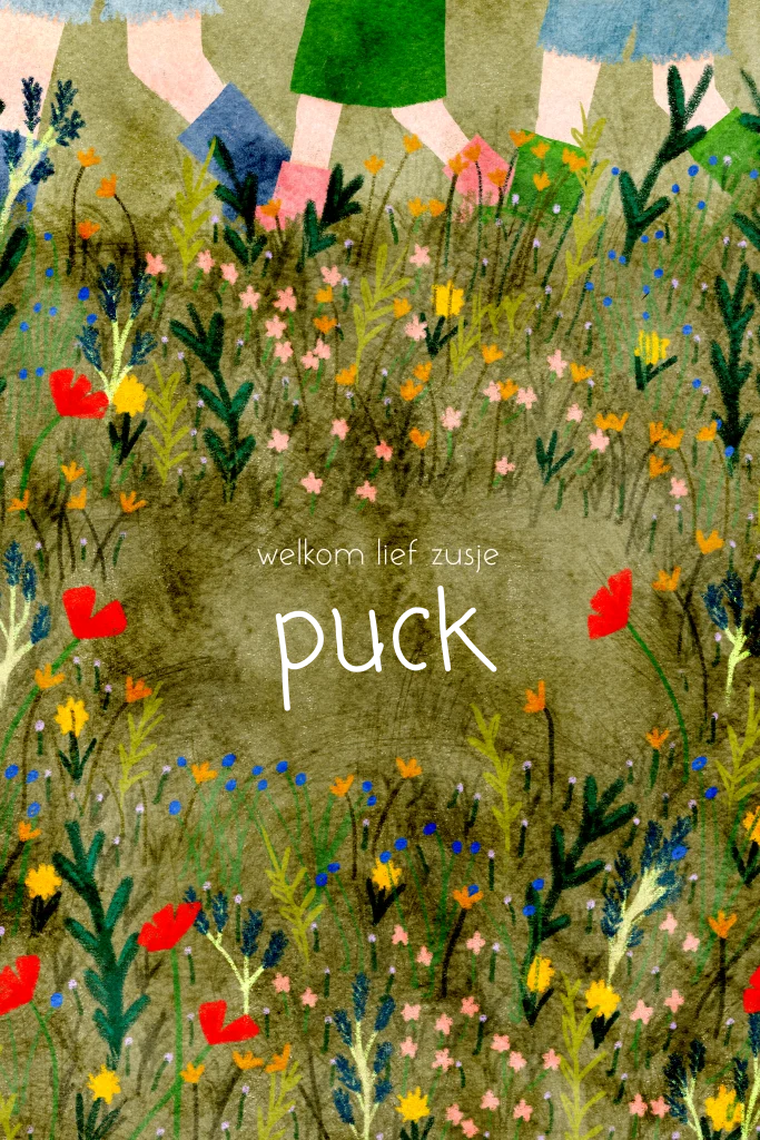 Een avontuurlijk lief geboortekaartje boordevol gezellige veldbloemen zoals klaprozen. Bovenin zie je de beentjes van twee grote broers en een klein zusje, die met hun laarsjes door het veld op avontuur gaan. Wil je bijvoorbeeld een andere huidskleur of samenstelling van kinderen? Stuur een berichtje, ik pas het heel eenvoudig voor je aan!