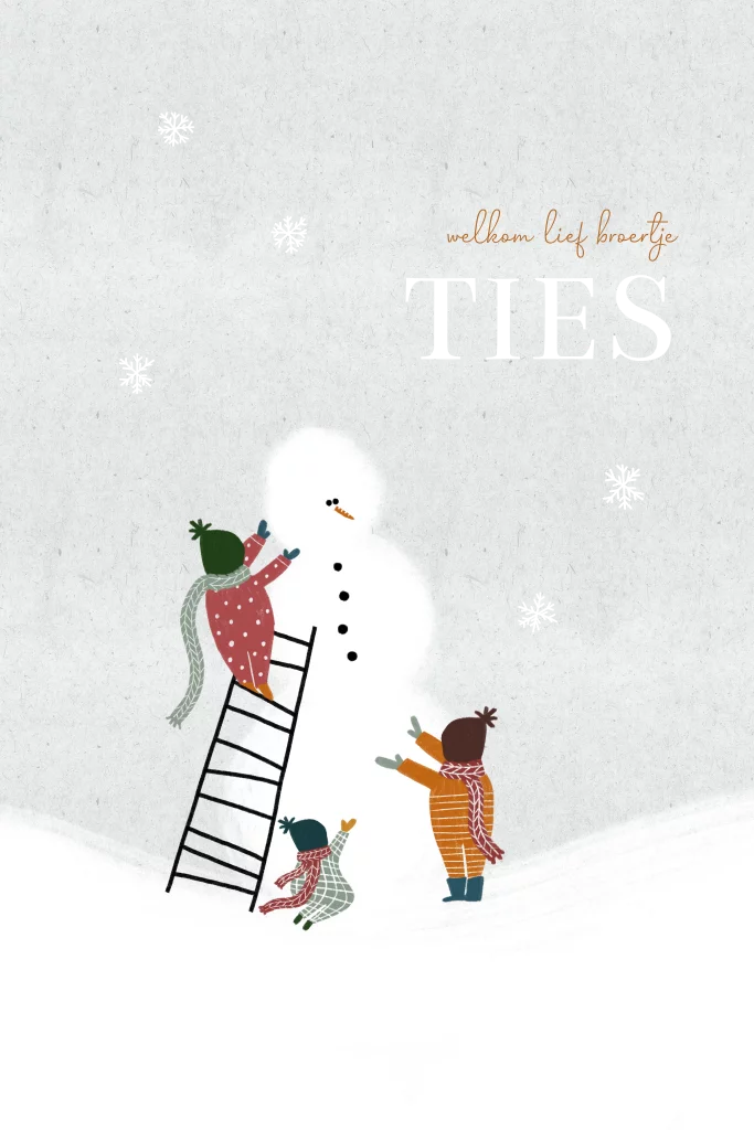 Een geboortekaartje voor een tweede of derde kindje, van drie kindjes die een sneeuwpop maken. Het kleinste kindje op de grond kun je verwijderen waardoor het ook geschikt is voor een tweede kindje. Pas alle kleuren aan naar wens.