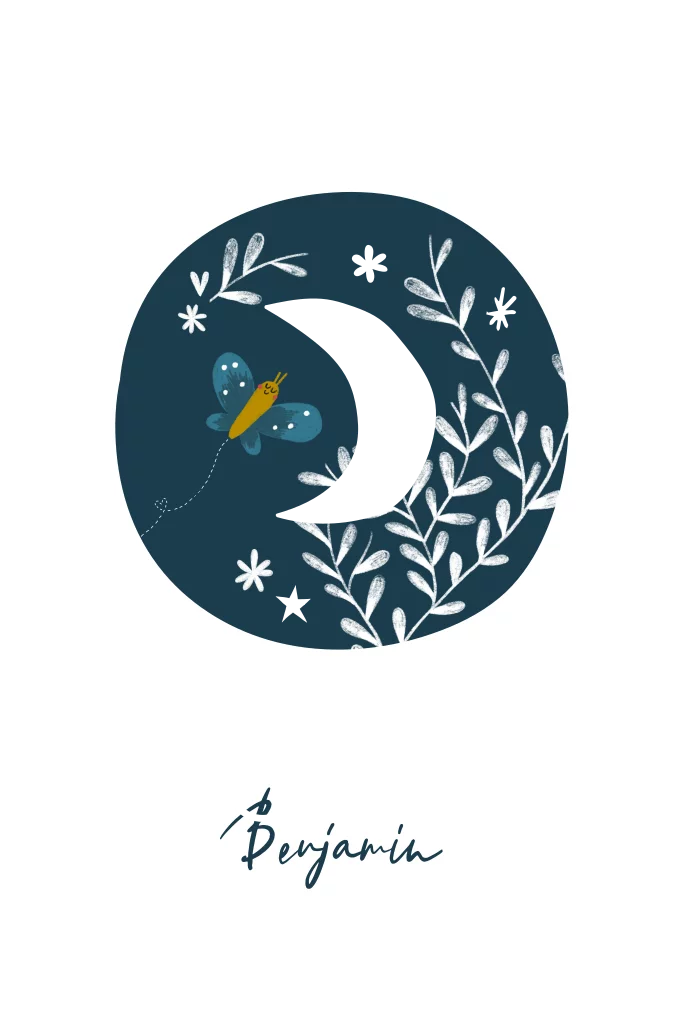 Een geboortekaartje in folkstijl met bohemian plantjes, goudfolie maantje en sterren en een vlinder. Pas het kaartje volledig naar wens aan!