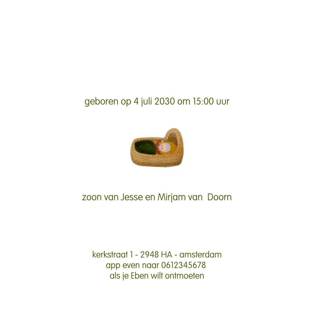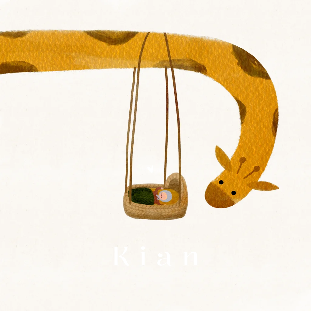 Dit bijzondere geboortekaartje toont een illustratie van een lange giraf die nieuwsgierig over het wiegje met baby buigt.