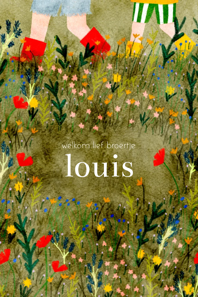 Een avontuurlijk lief geboortekaartje boordevol gezellige veldbloemen zoals klaprozen. Bovenin zie je de beentjes van een grote broer en kleine broer, die met hun laarsjes door het veld op avontuur gaan. Wil je bijvoorbeeld een andere huidkleur? Stuur een berichtje, ik pas het heel eenvoudig voor je aan!