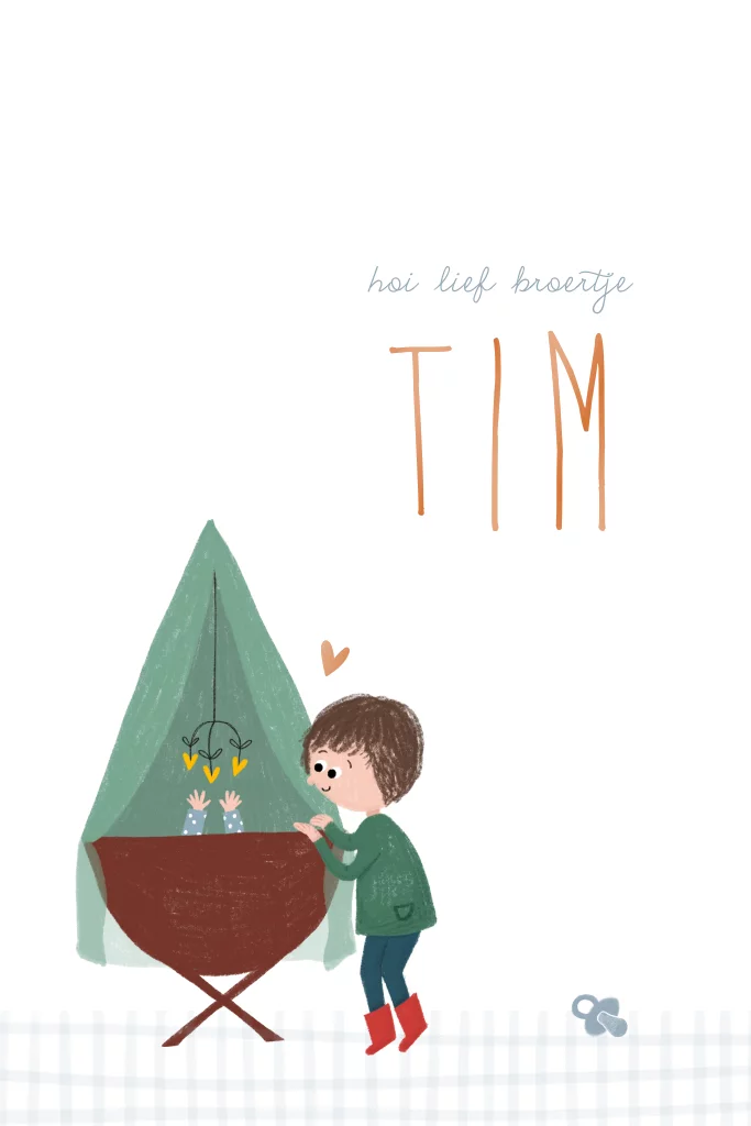 Een lief geboortekaartje met een illustratie van een grote broer die over het wiegje kijkt naar zijn kleine broertje. Met leuke illustraties van de babykamer en speelgoed. Kies zelf een ander wiegje of zusje uit de beeldbank. Een andere wijziging aan het broertje? Neem even contact op!