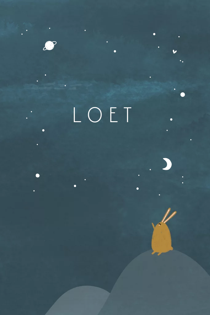 Een lief dromerig geboortekaartje met een heelal in goudfolie en een konijntje wat ernaar kijkt.