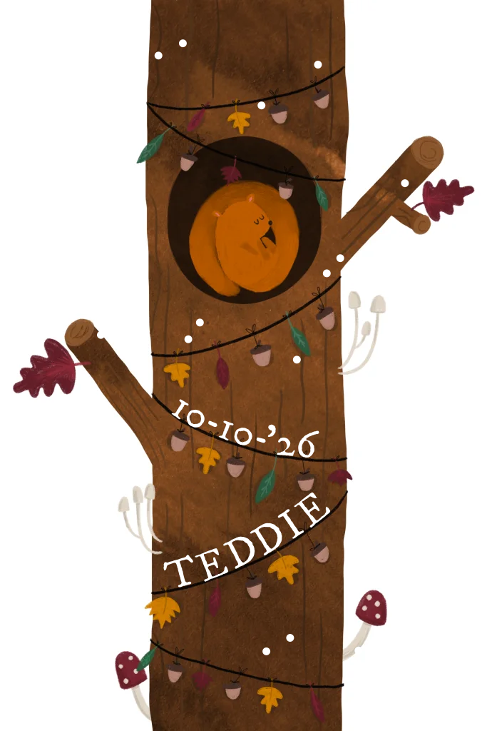 Een lief herfst geboortekaartje met een boom waar een klein eekhoorntje in slaapt.