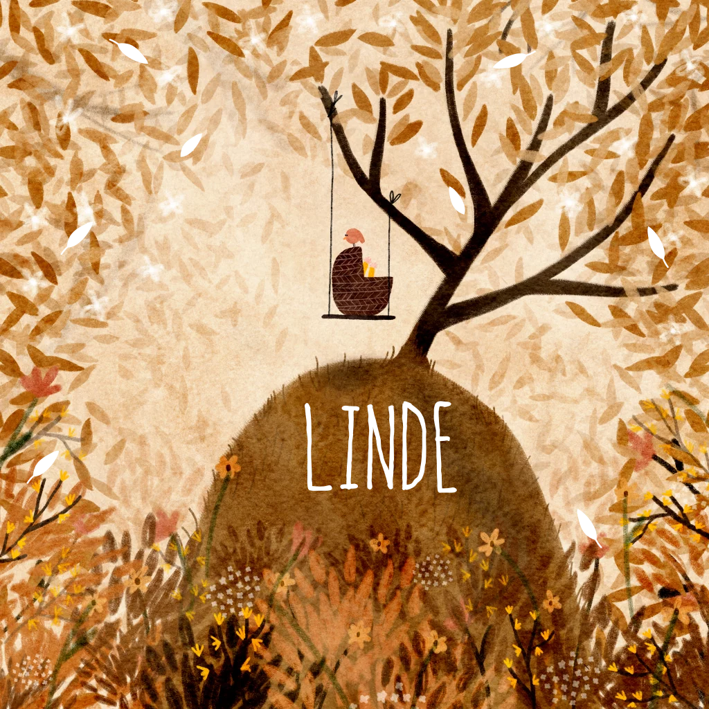 Een geïllustreerd geboortekaartje met vrolijk tafereel van een bos vol blaadjes en bloemen in warme nazomer herfst tinten met goudfolie, met een schommel waar een wiegje op staat met lieve babyhandjes.