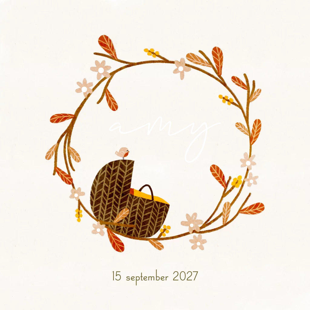 Geboortekaartje herfst indian summer krans blaadjes mozesmandje