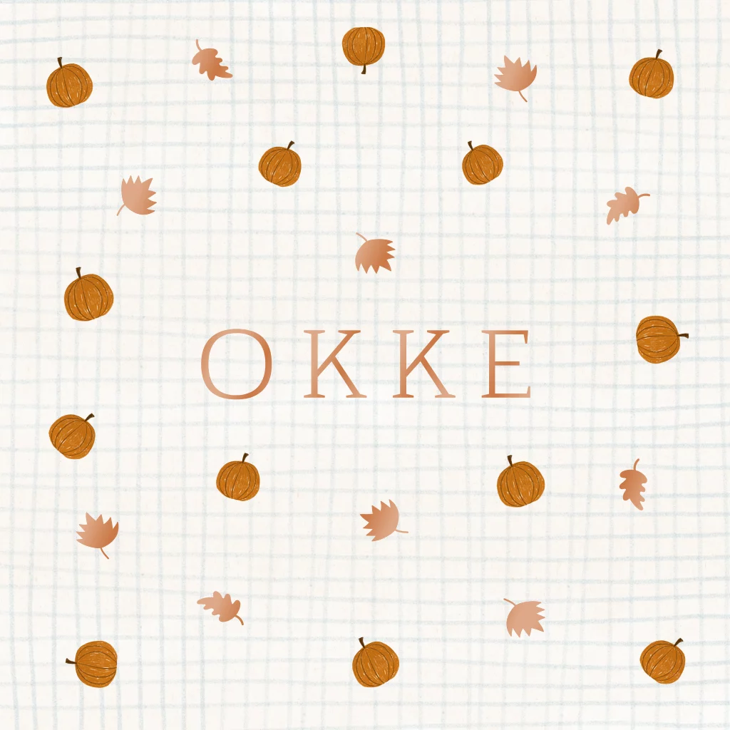Een lief geboortekaartje voor de herfst met een patroontje van pompoentjes en herfstblaadjes, op een ruitjes achtergrond. Deze kun je ook zelf verwijderen.