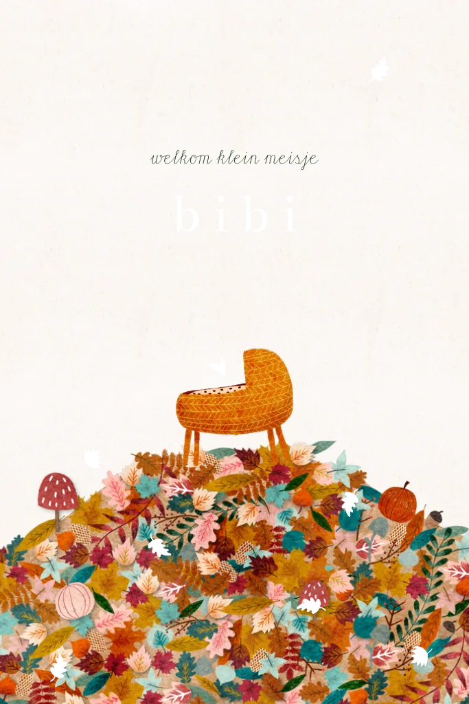 Een lief vrolijk geboortekaartje met een wiegje bovenop een berg van herfstblaadjes met een pompoentje en paddenstoel, in warme nazomer en herfst tinten. Met foliedruk details zoals blaadjes.