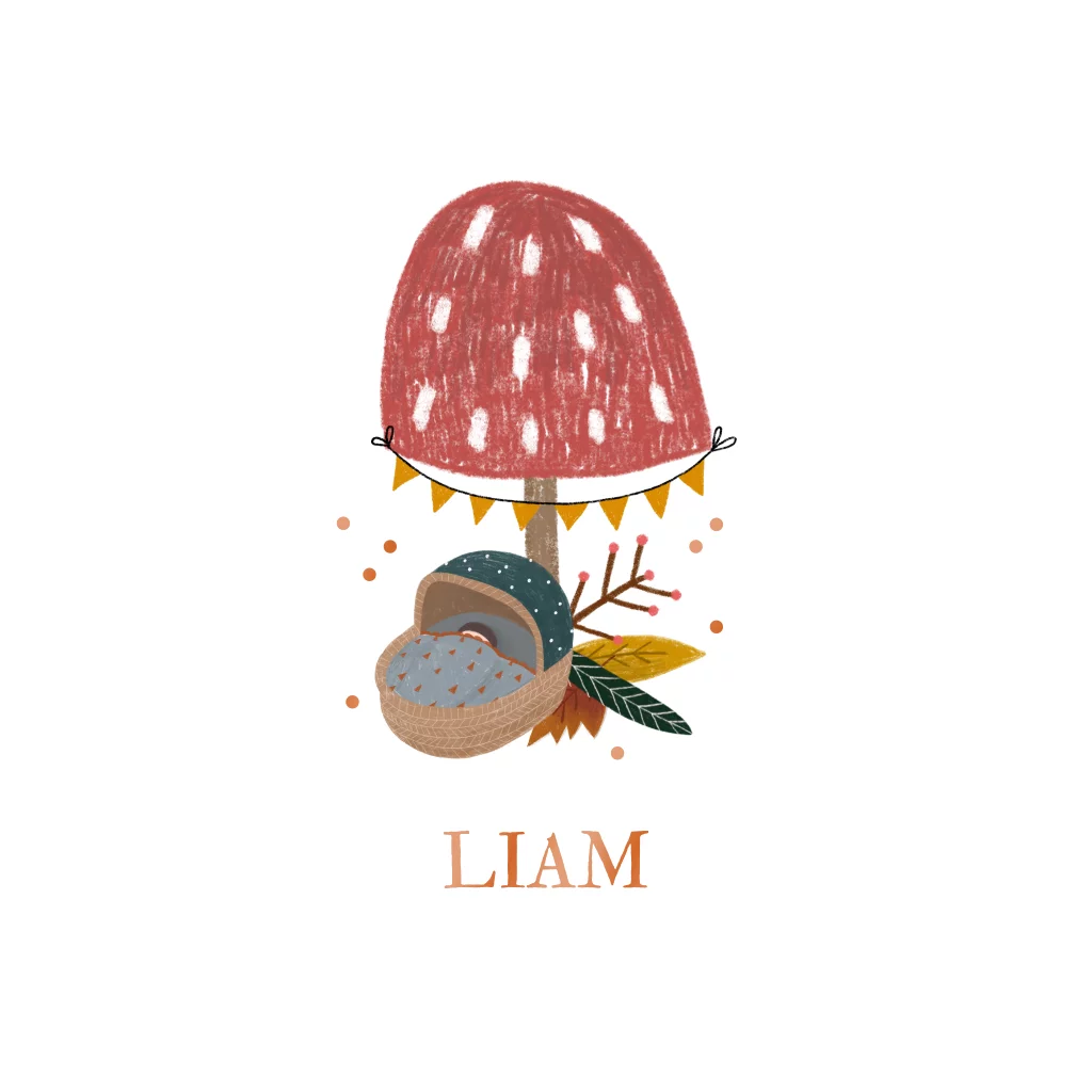 Een herfstig geboortekaartje met een wiegje onder een paddenstoel en herfstblaadjes.