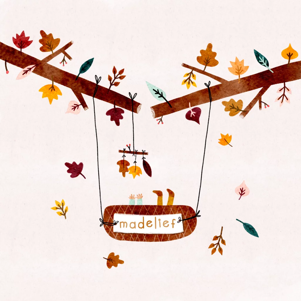 Een lief vrolijk herfst geboortekaartje met een illustratie van een wiegje, die hangt aan een boom en heel veel herfstblaadjes. De naam kun je leuk speels op het wiegje vermelden. Liever een ander formaat? Laat het even weten!