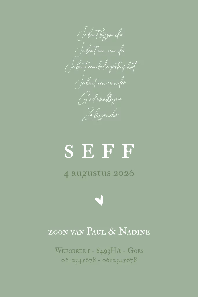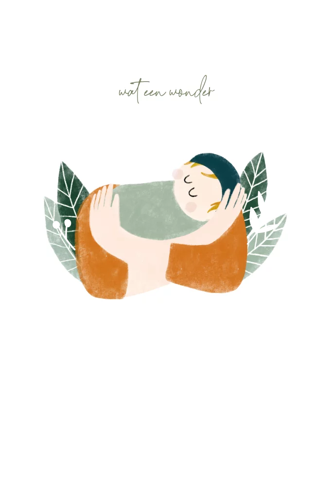 Een geboortekaartje met een lieve illustratie van een baby, veilig in de armen van zijn ouder(s). Je kunt de mouwen verschillende kleuren geven om een idee te geven van twee ouders. Je kunt alle kleuren aanpassen naar wens. Dit kaartje is heel erg geschikt als christelijk geboortekaartje.