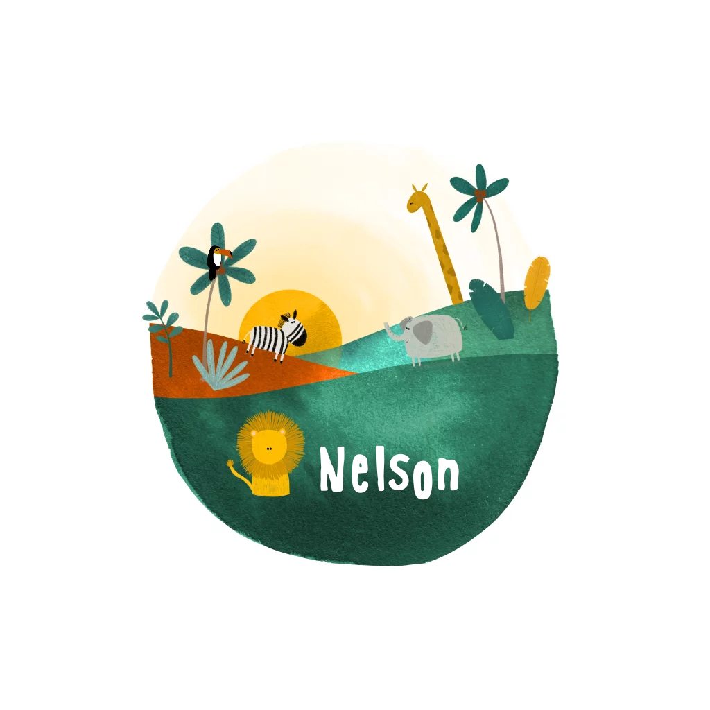 Een geboortekaartje met een waterverf wereld met jungle dieren en goudfolie.