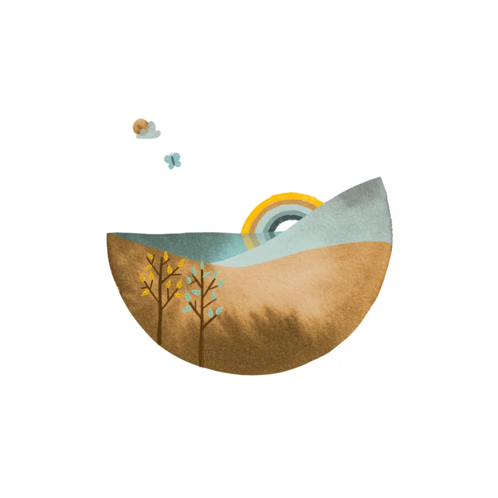 Een rustig geboortekaartje in warme tinten met een waterverf landschapje en een regenboog. De naam en datum staat in goudfolie, kies zelf een andere foliekleur.