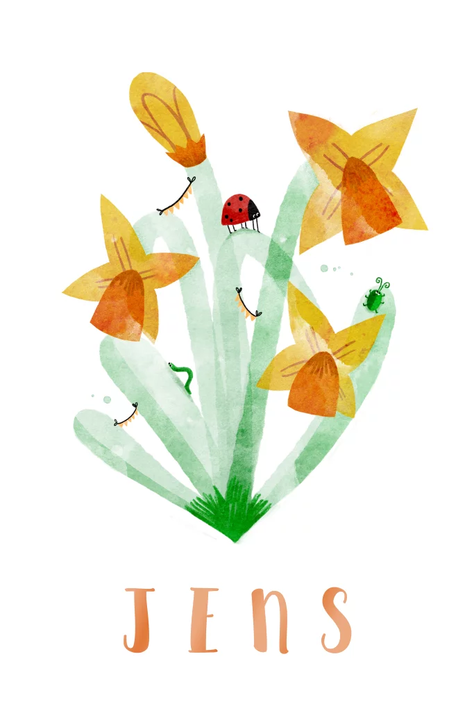 Geboortekaartje lente narcis waterverf diertjes