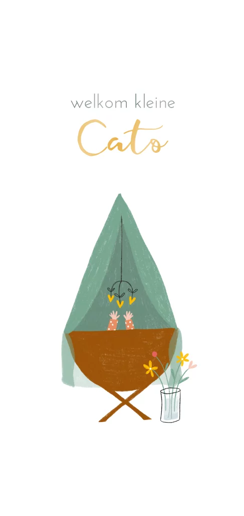 Een lief huiselijk kaartje met een wiegje in warme kleuren en de naam in hoogglans. Zo schattig met die kleine babyhandjes!