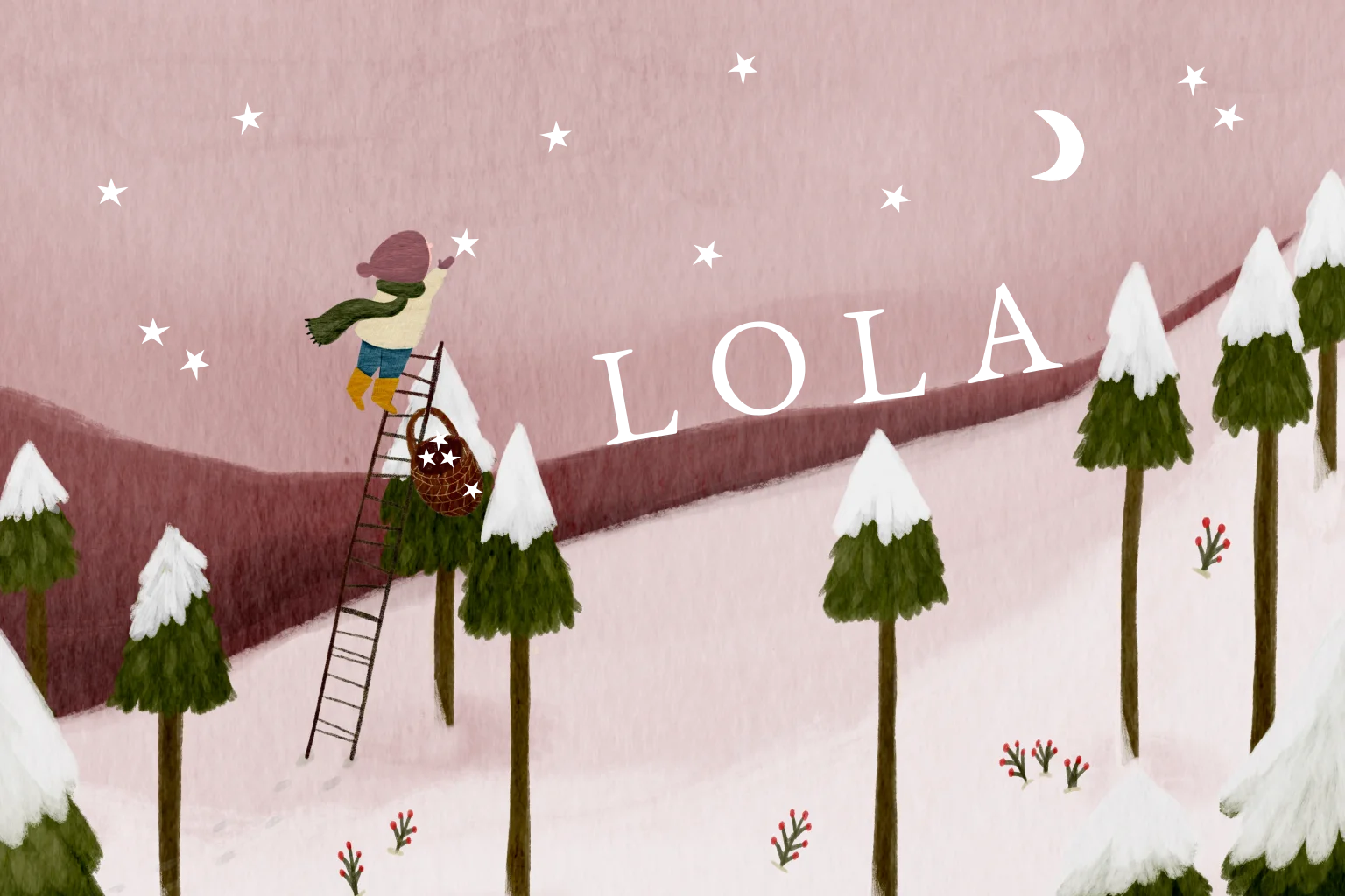 Vier de komst van jullie dochter met dit originele geboortekaartje in een roze winters bos thema. De illustratie met bomen, goudfolie sterren en maan en een kindje die de sterren uit de hemel plukt straalt warmte en magie uit. Dit kaartje is perfect voor wie op zoek is naar een uniek geboortekaartje voor een meisje, met natuur en een sprookjesachtig tintje. Andere kleurstelling? Mail even, we passen het snel voor je aan!