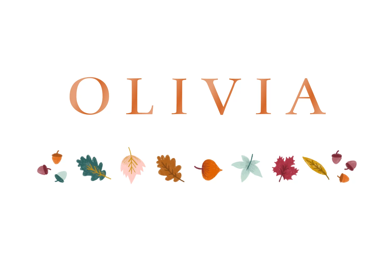 Een rustig geboortekaartje met herfstblaadjes en hoogglans details. Kies zelf de kleur van de achtergrond en het folie uit!