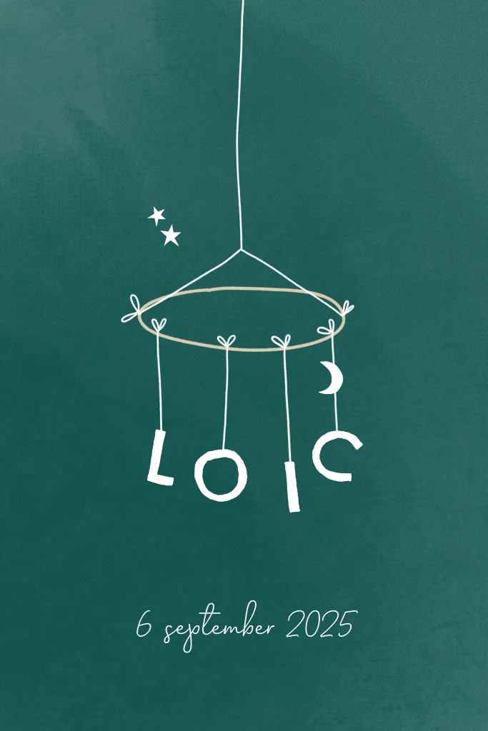 Een geboortekaartje met de naam aan een mobile, in goudfolie. Wil je een langere naam aan de mobile hangen? Copy paste een van de losse touwtjes en hang er een extra letter aan.