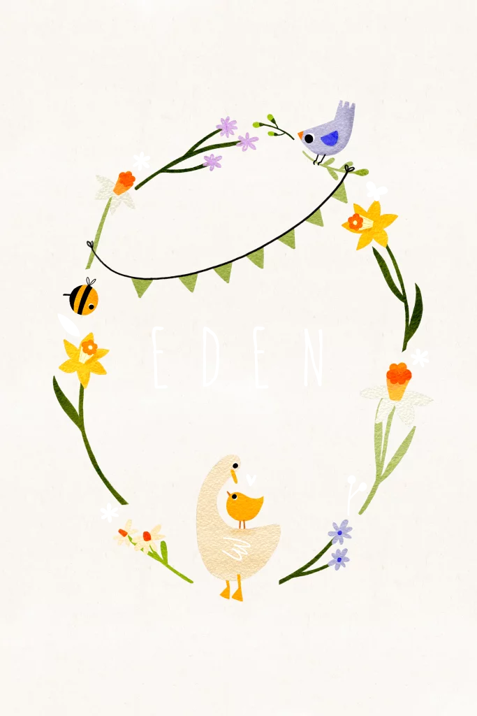Een krans van narcissen en andere bloemen, een schattige bij, een gans en een kuikentje staan op dit lieve vrolijke geboortekaartje. Een prachtig tafereel in zonnige geeltinten in combi met groen en lila, ideaal om de geboorte van je baby in de lente of zomer aan te kondigen.