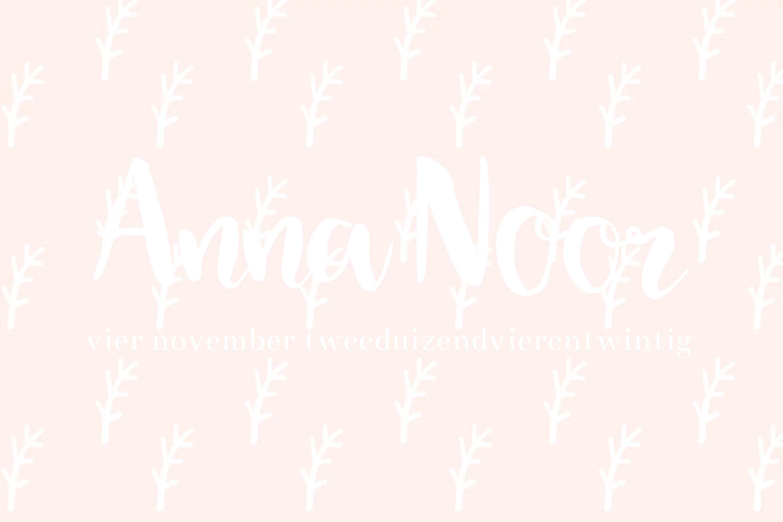Een eenvoudig geboortekaartje met de naam en datum in goudfolie, op een patroontje van witte takjes op zachtroze.