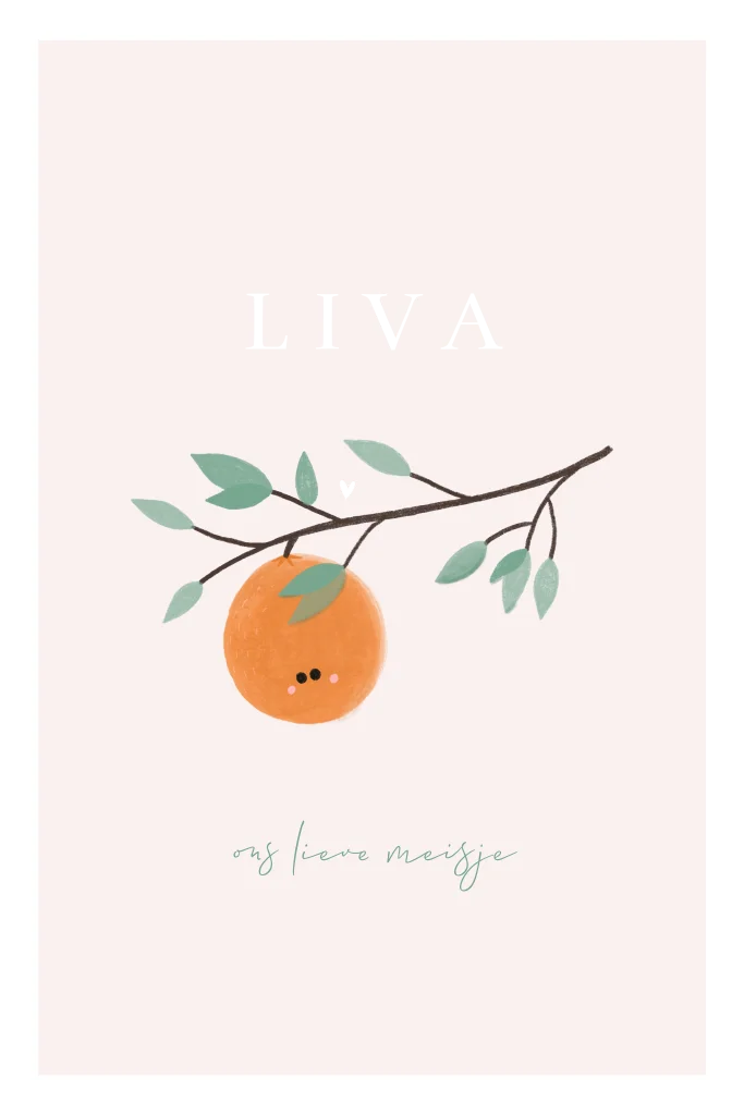 Een rustig minimalistisch geboortekaartje, met een schattige sinaasappel aan een takje. Helemaal hip met fruit in zachte kleuren! Kijk in de editor bij Wiegje en verander de kleur van het wiegje.