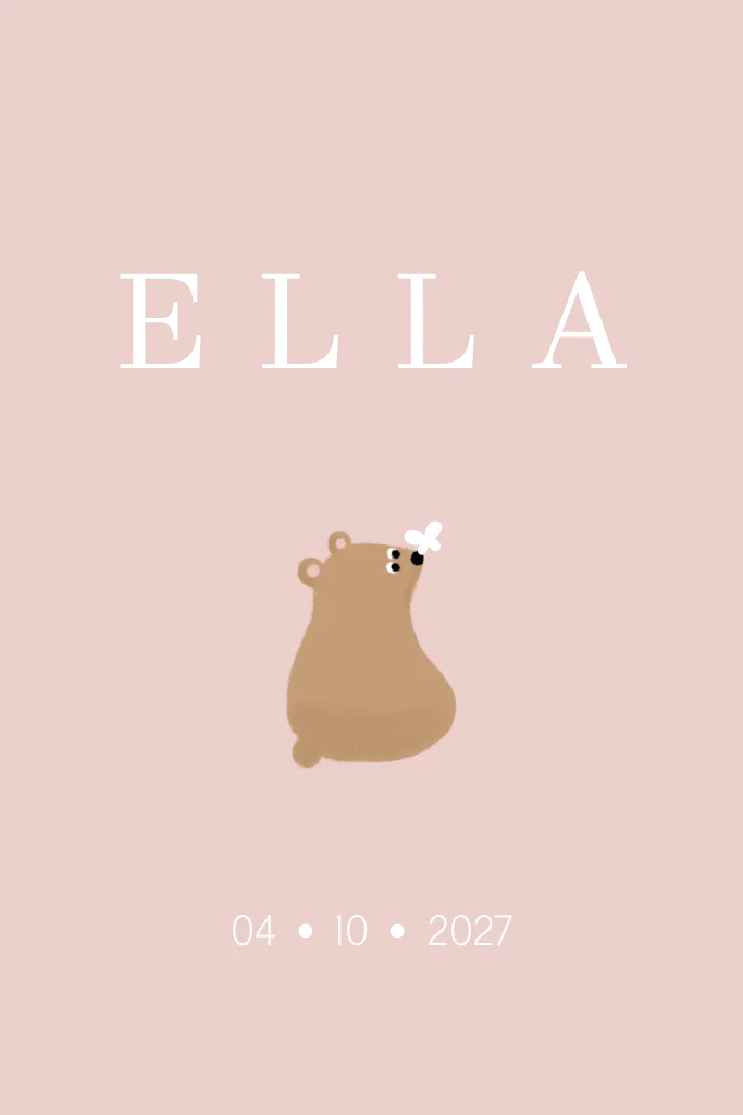 Dit lieve geboortekaartje heeft rustige tinten en een illustratie van een lief beertje met een vlinder op de neus. De achtergrond heeft een mooie rustige dusty pink kleur. Je kunt de koperfolie wijzigen en de verdere kleuren ook!