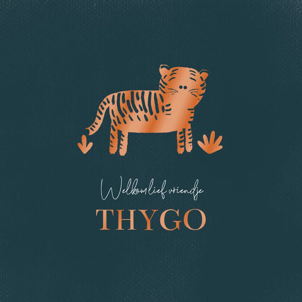 Een minimalistisch geboortekaartje met een tijgertje in hoogglans details.