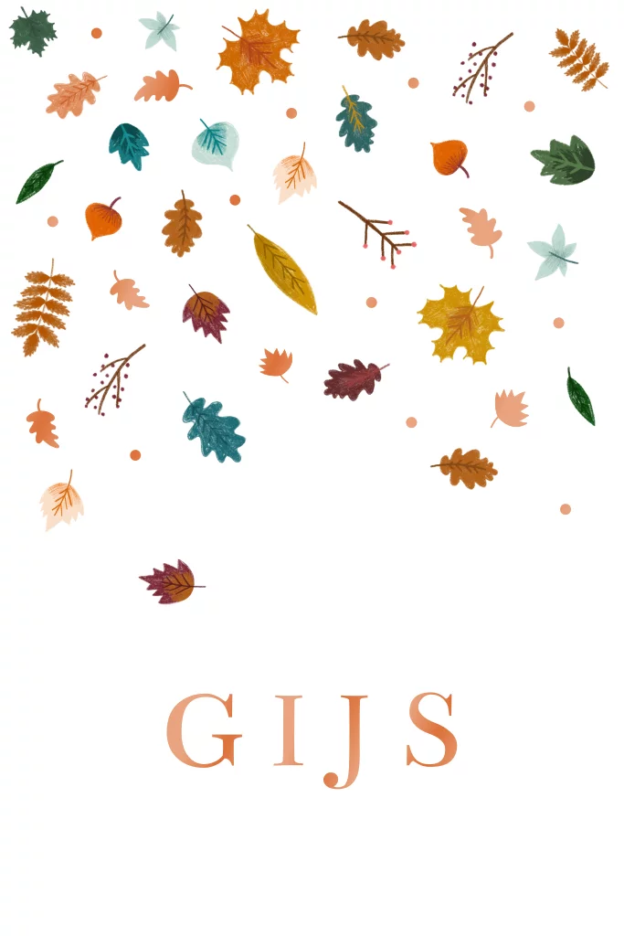 Een geboortekaartje voor een herfst kindje met heel veel vallende herstbladeren en hoogglans details.
