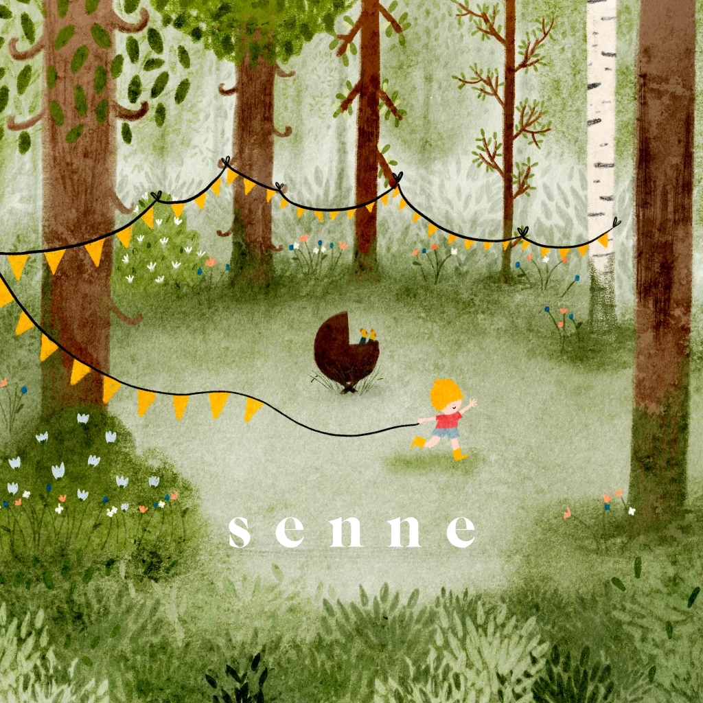 Een geïllustreerd geboortekaartje met zomers tafereel van een vrolijk bos vol blaadjes en bloemen, gezellige slingers, en een wiegje met lieve voetjes. Grote broer hangt de slingers op. Andere huidskleur en haarkleur? Stuur een mailtje, ik pas het snel voor je aan!