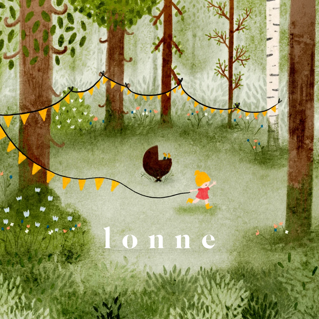 Een geïllustreerd geboortekaartje met zomers tafereel van een vrolijk bos vol blaadjes en bloemen, gezellige slingers, en een wiegje met lieve voetjes. Grote zus hangt de slingers op. Andere huidskleur en haarkleur? Stuur een mailtje, ik pas het snel voor je aan!