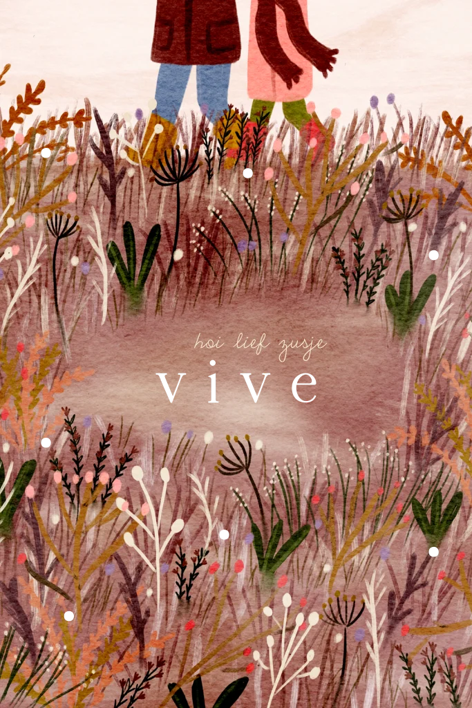 Dit lieve geboortekaartje laat een verstild winters landschap zien vol veldbloemen, grassprieten en zachte aardetinten met roze en paarse accentkleuren. Subtiel en dromerig, met een warme winterse sfeer zonder sneeuw of kerst elementen. Perfect voor wie houdt van natuur, buiten zijn en een kaartje dat net even anders is. Grote broer of zus krijgt ook ruimte op het kaartje, samen op avontuur. De foliedruk bolletjes en naam op de kaart maken het helemaal af. Wil je iets aangepast zien of nog meer kindjes op het kaartje? Mail even!