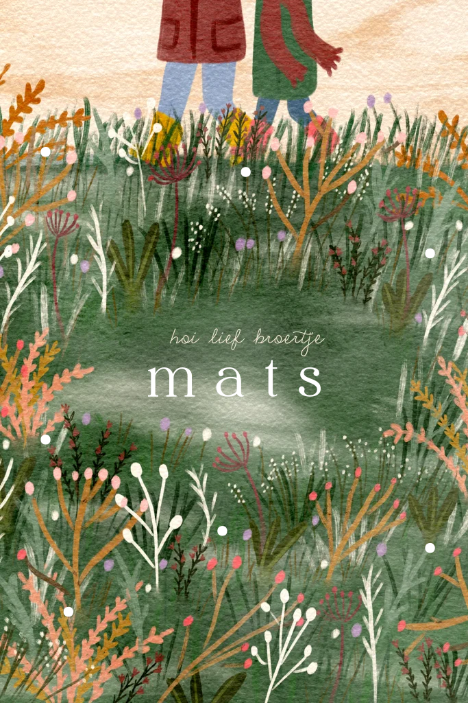 Dit lieve geboortekaartje laat een verstild winters landschap zien vol veldbloemen, grassprieten en zachte aardetinten met goudfolie details. Subtiel en dromerig, met een warme winterse sfeer zonder sneeuw of kerst elementen. Perfect voor wie houdt van natuur, buiten zijn en een kaartje dat net even anders is. Grote broer of zus krijgt ook ruimte op het kaartje, samen op avontuur. De foliedruk bolletjes en naam op de kaart maken het helemaal af. Wil je iets aangepast zien of nog meer kindjes op het kaartje? Mail even!