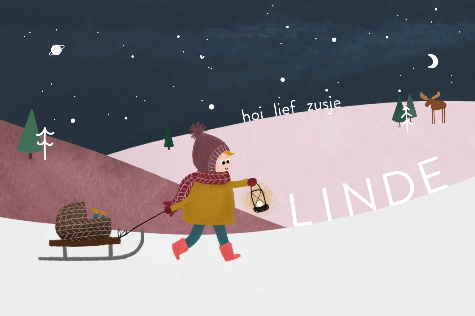 Een lief geboortekaartje met een grote broer of zus die op avontuur gaat met baby broertje op een slee in een winternacht, met goudfolie details. Andere huidskleur of haarkleur? Klik dan op het gezichtje of op het haar en pas de kleur zelf aan.